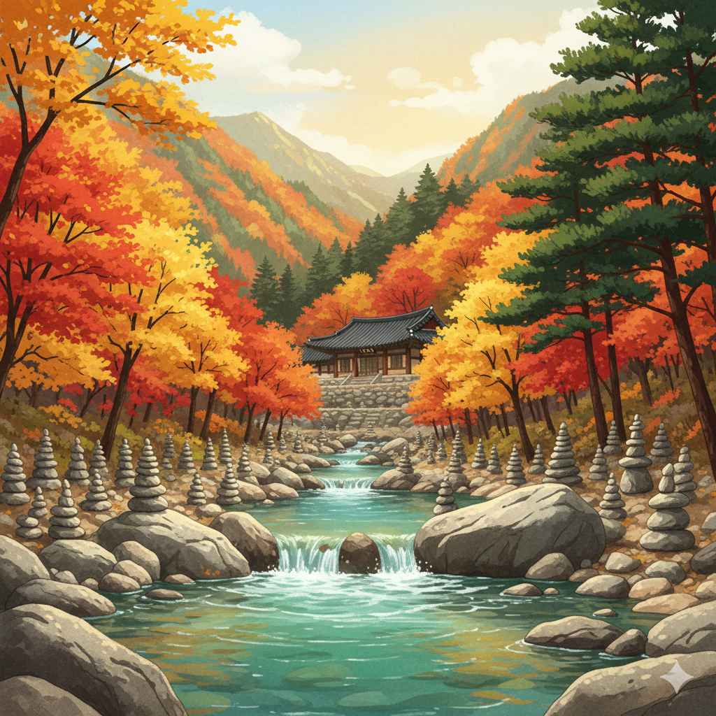 - 계곡을 가로지르는 '수심교' 다리를 건너, 만해 한용운 선생의 숨결이 깃든 천년고찰 '백담사' 경내를 여유롭게 산책합니다. 고즈넉한 사찰의 풍경과 화려한 단풍의 조화가 마음의 평온을 가져다줍니다.