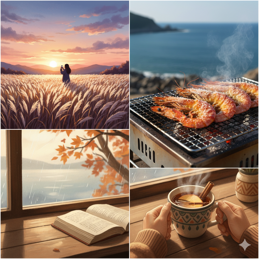 이번 주말, 여러분은 어떤 가을을 만나고 싶으신가요? 눈부신 억새밭으로, 고소한 대하구이를 맛보러, 혹은 나만의 아늑한 홈카페로.
