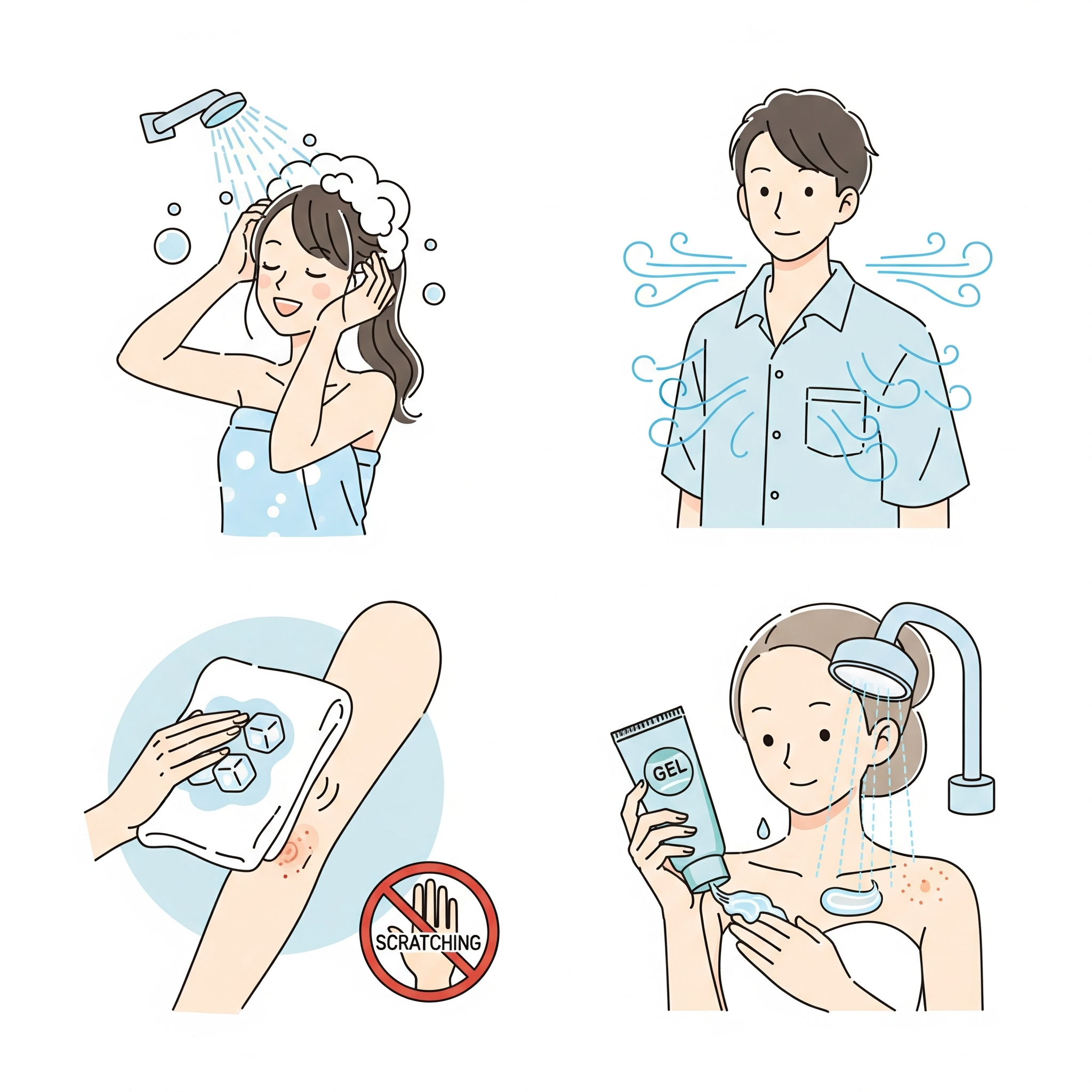 - 냉찜질: 가려운 부위에 차가운 물수건이나, 수건으로 감싼 아이스팩을 10~15분 정도 올려두면, 가려움증과 염증을 가라앉히는 데 큰 도움이 됩니다.