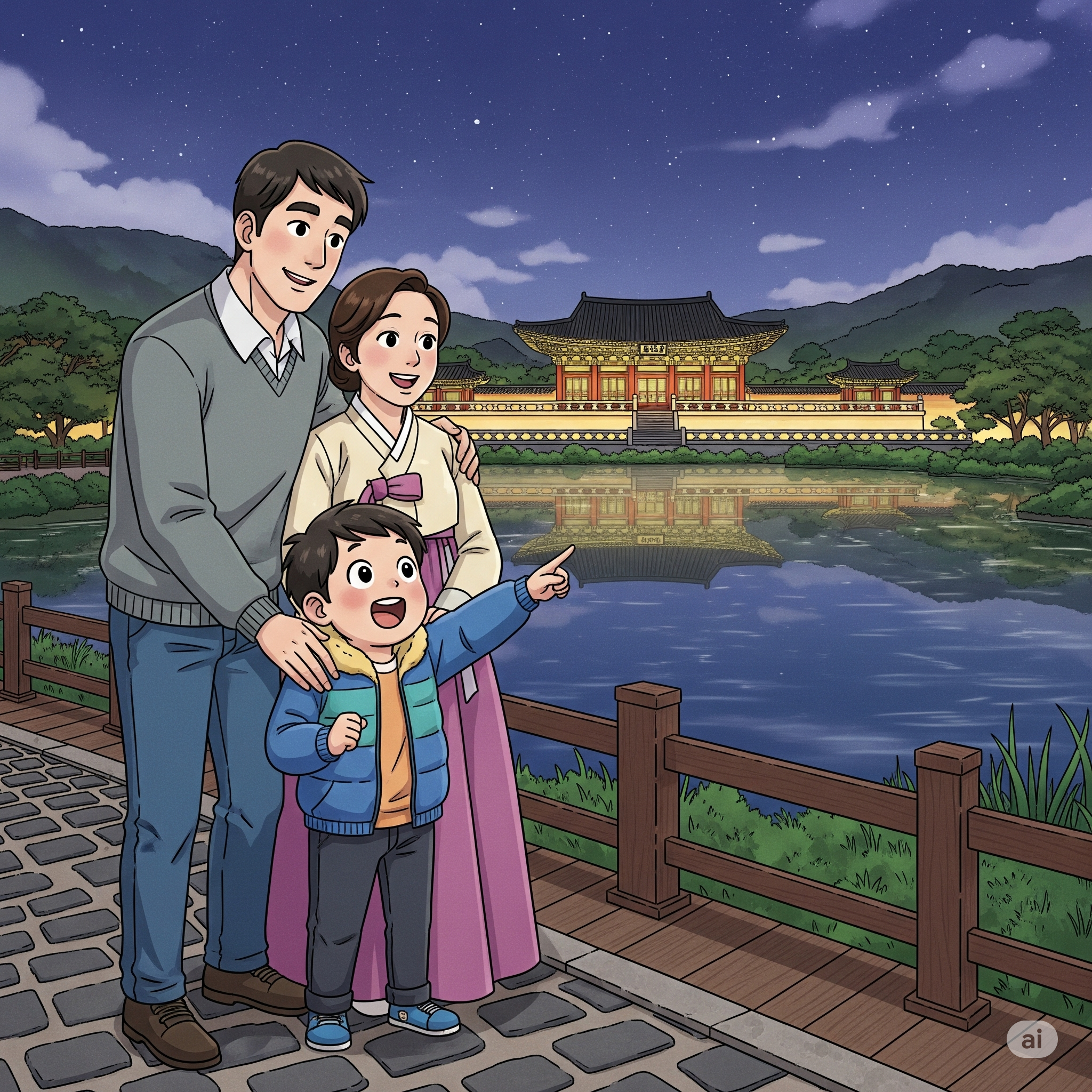 이어서 찾은 곳은 경주 야경의 끝판왕, '동궁과 월지(구 안압지)'입니다. 어둠 속에서 화려한 조명을 받아 빛나는 궁궐과, 그 모습이 고스란히 비치는 잔잔한 연못은 그야말로 환상적입니다. "우와, 물속에도 궁전이 있어!" 아이의 외침에 가족 모두가 웃음 짓습니다. 낮 동안의 역사 공부가 밤의 아름다운 풍경과 어우러지며, 잊지 못할 경주의 첫날밤을 완성합니다.