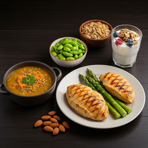 - 다양한 단백질 식품 섭취: 동물성 단백질(육류, 생선, 계란, 유제품)과 식물성 단백질(콩, 두부, 견과류, 씨앗류)을 골고루 섭취하여 다양한 아미노산을 섭취하는 것이 좋습니다.
