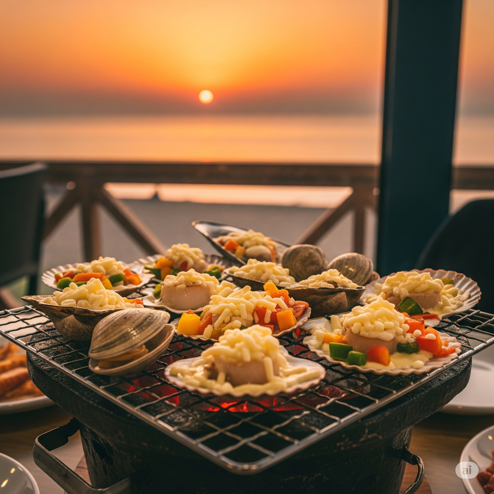 붉게 물드는 서해의 낙조, 철썩이는 파도 소리, 그리고 타닥타닥 소리를 내며 익어가는 조개와, 고소한 치즈 녹는 냄새... 생각만 해도 군침이 돌고, 마음이 낭만으로 가득 차는 풍경이죠? '조개구이'는 단순히 음식이 아닙니다. 바다와 노을, 그리고 좋은 사람과 함께하는 '분위기'이자 '경험'입니다.
