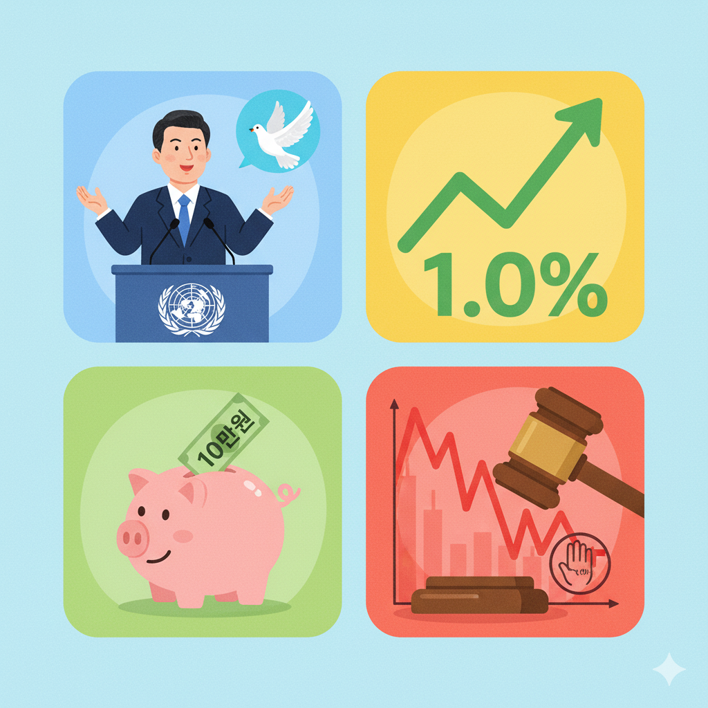 이재명 대통령의 UN 총회 연설에서 나온 새로운 한반도 평화 구상부터, 우리 지갑과 직결되는 소비쿠폰 신청 현황까지. 오늘 하루도 우리 삶에 영향을 미칠 중요한 정책 소식들이 쏟아졌습니다. 오늘 당신이 꼭 알아야 할 주요 뉴스들을 알기 쉽게 정리해 드립니다.