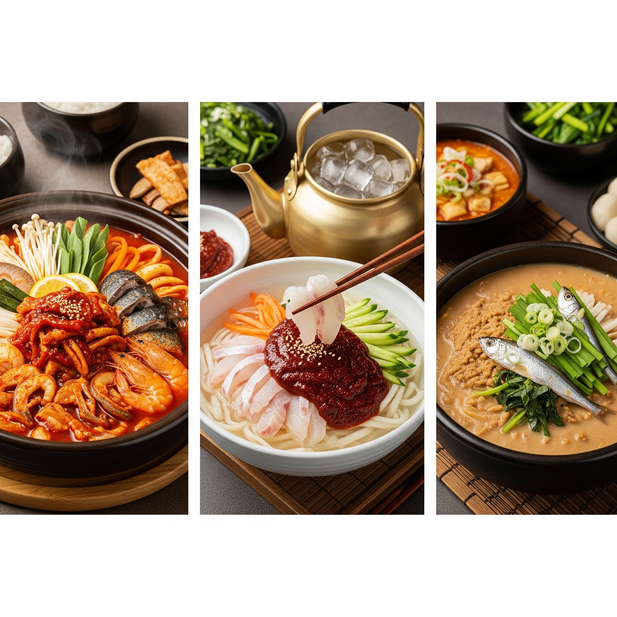 특징: 커다란 항아리나 그릇에, 다양한 종류의 활어회, 오징어, 전복, 해삼, 멍게 등 온갖 해산물을 아낌없이 때려 넣는 '해산물 어벤져스' 스타일입니다. 새콤달콤한 고추장 베이스 육수가 기본이며, 소면과 밥이 함께 나와, 회를 건져 먹고, 국수를 말아 먹고, 마지막에 밥까지 말아 먹는 3단 콤보의 즐거움을 선사합니다.