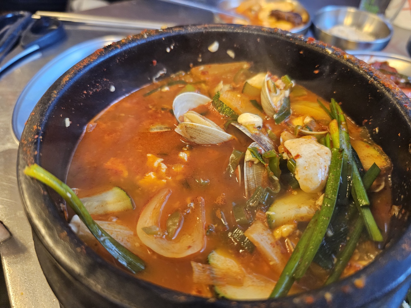 고기를 먹던 중간에 **바지락 듬뿍 순두부찌개(9,900원)**를 주문했습니다. 칼칼한 국물로 입가심을 하고 싶었거든요. 그런데 한참을 기다려도 찌개가 나올 기미가 보이지 않아 사장님께 조심스럽게 여쭤보았습니다.