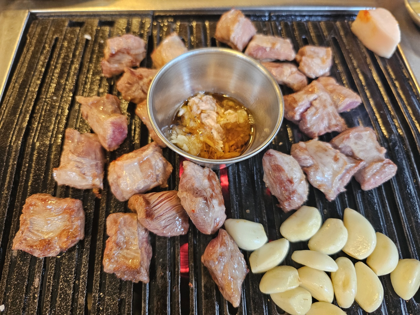 함께 차려진 밑반찬들도 하나같이 정갈하고 맛깔스러웠는데요, 특히 제 입맛을 사로잡았던 건 바로 알싸하게 잘 익은 파김치였습니다. 숯불 위에서 노릇노릇 익어가는 갈매기살 한 점을 파김치에 싸서 먹으니 그야말로 환상의 궁합을 자랑하더군요. 씹을수록 터져 나오는 육즙과 부드러운 식감은 왜 아들이 그토록 추천했는지 바로 알게 해주는 맛이었습니다.