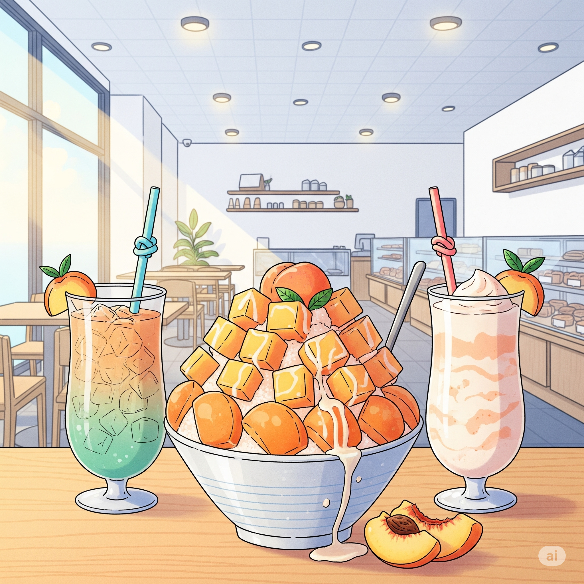 - 장점: 부드러운 우유 얼음 위로, 이름처럼 달콤한 황도 복숭아가 '와르르' 쏟아져 내리는 비주얼을 자랑합니다. 상큼한 복숭아 맛이 듬뿍 담긴 얼음과 과육이 어우러져, 찜통더위를 한 방에 날려버릴 청량감을 선사합니다.