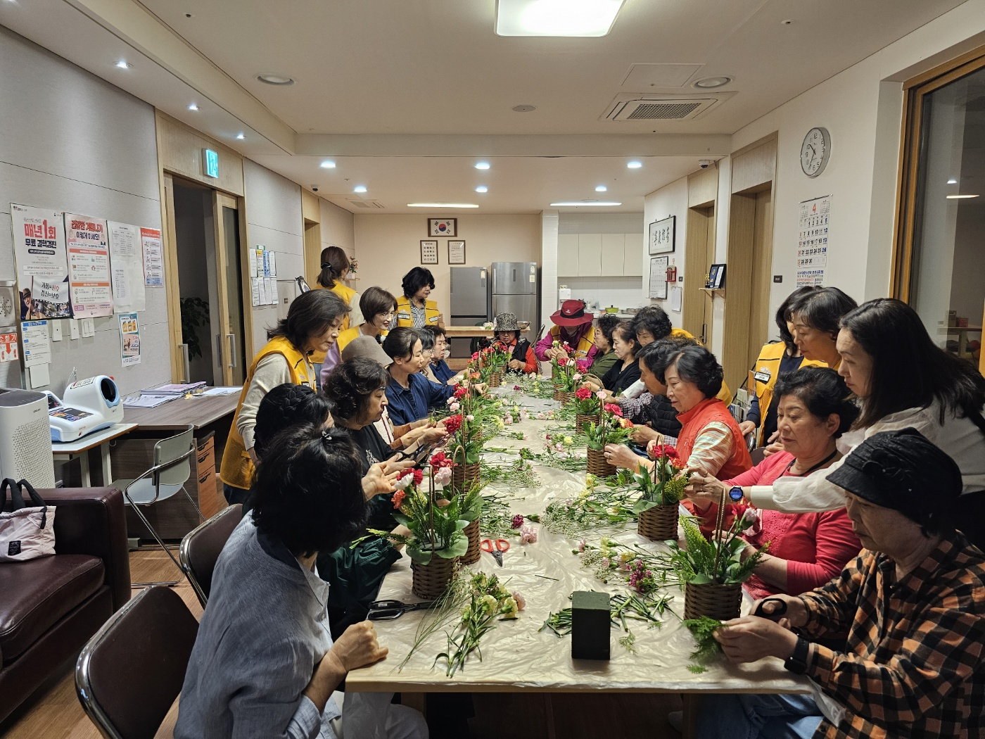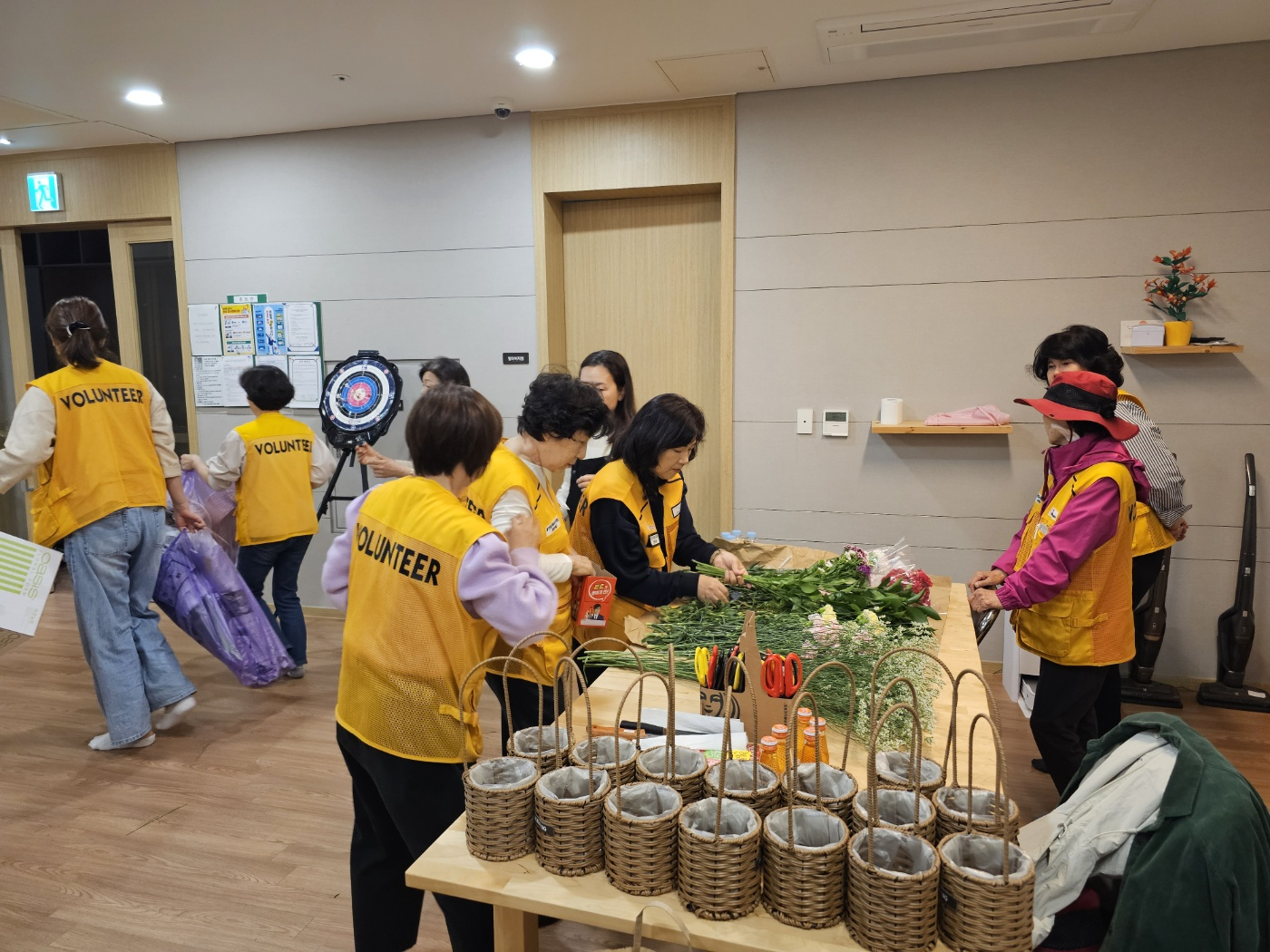 우리 봉사단원들이 곁에서 도와드리니 모두 무사히 예쁜 꽃바구니를 완성하셨어요.