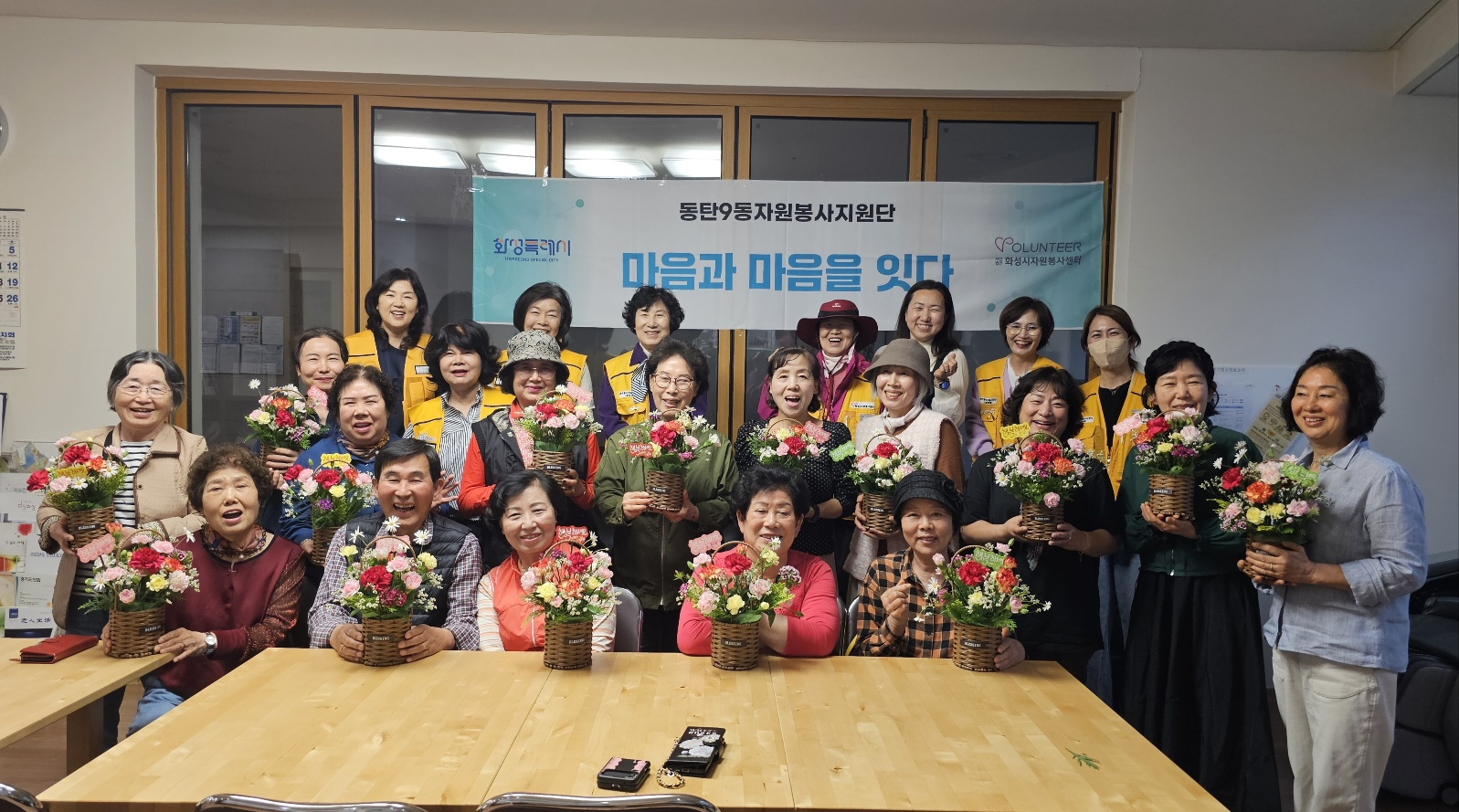 우리 봉사단원들이 곁에서 도와드리니 모두 무사히 예쁜 꽃바구니를 완성하셨어요.
