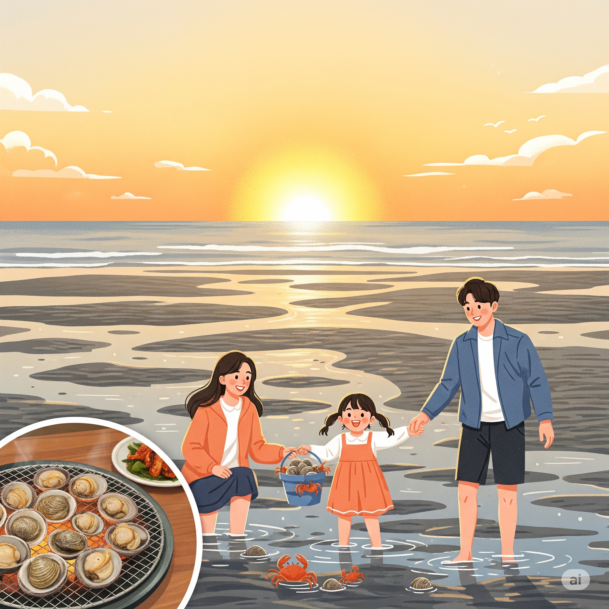 신나게 물놀이를 즐긴 후, 해 질 녘이 되면 온 가족이 해변에 나란히 앉아보세요. 하루를 마감하는 붉은 태양이, 드넓은 갯벌과 바다를 온통 황금빛으로 물들이는 풍경은 그 자체로 한 편의 감동적인 영화입니다. "오늘 하루도 즐거웠다"고 말없이 위로를 건네는 듯한 서해의 낙조는, 우리 가족에게 잊지 못할 추억을 선물합니다.