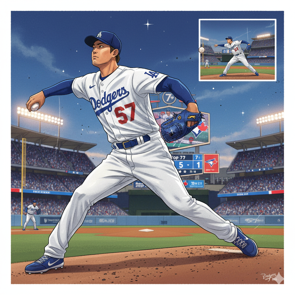 오늘 승리의 일등 공신은 단연 선발 투수 야마모토 요시노부였습니다. 그는 9이닝 동안 단 105개의 공만 던지며 토론토 강타선을 단 1실점(4피안타)으로 꽁꽁 묶는 완투승을 거뒀습니다. 지난 내셔널리그 챔피언십시리즈 2차전 완투승에 이은 2경기 연속 완투승! 이는 2001년 '전설' 커트 실링 이후 24년 만에 나온 포스트시즌 대기록입니다.