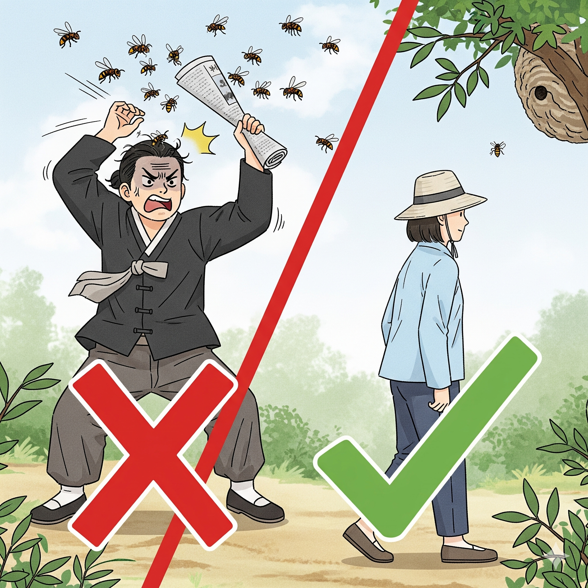 만약 실수로 벌집을 건드렸다면, 패닉에 빠져 잘못된 행동을 하는 것이 더 큰 사고를 유발합니다.
