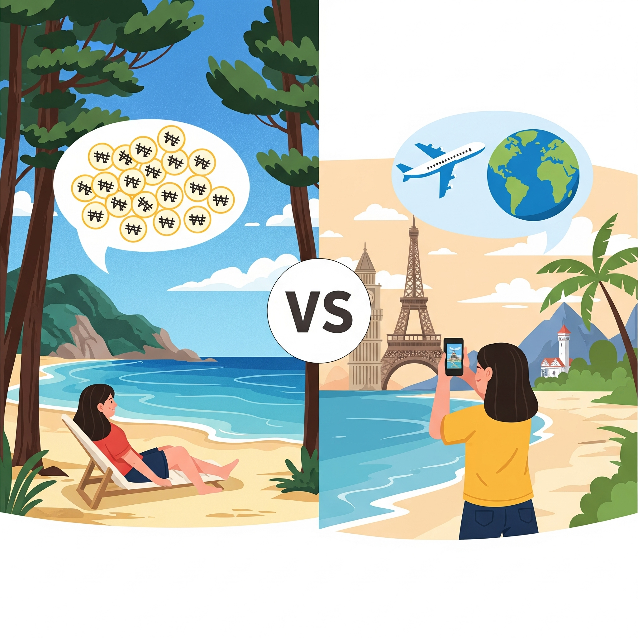 오늘, 직장인의 가장 현실적인 기준인 시간, 비용, 힐링, 편의성 네 가지 라운드를 통해, '국내 여행'과 '해외여행'의 장단점을 낱낱이 비교 분석해 드립니다. 이 글을 보시고 당신에게 꼭 맞는 최고의 여름휴가를 선택해 보세요.