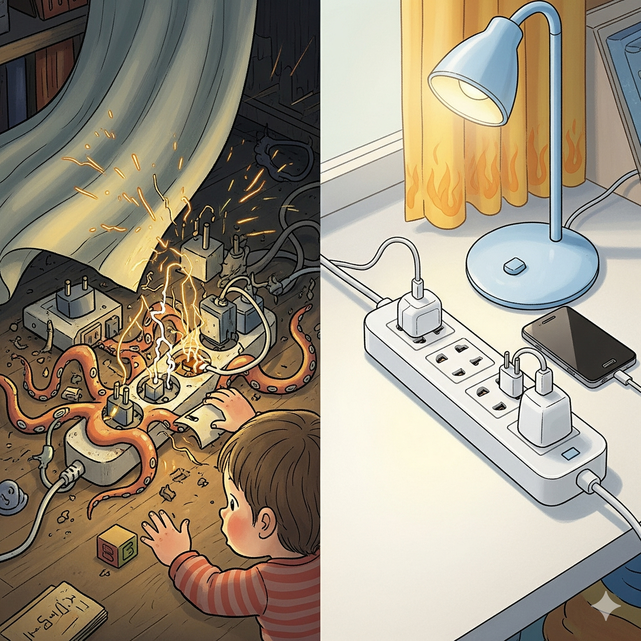 - 🐙 문어발식 사용: 멀티탭에 또 다른 멀티탭을 꽂아 문어발처럼 사용하는 것은 과부하의 주범입니다.