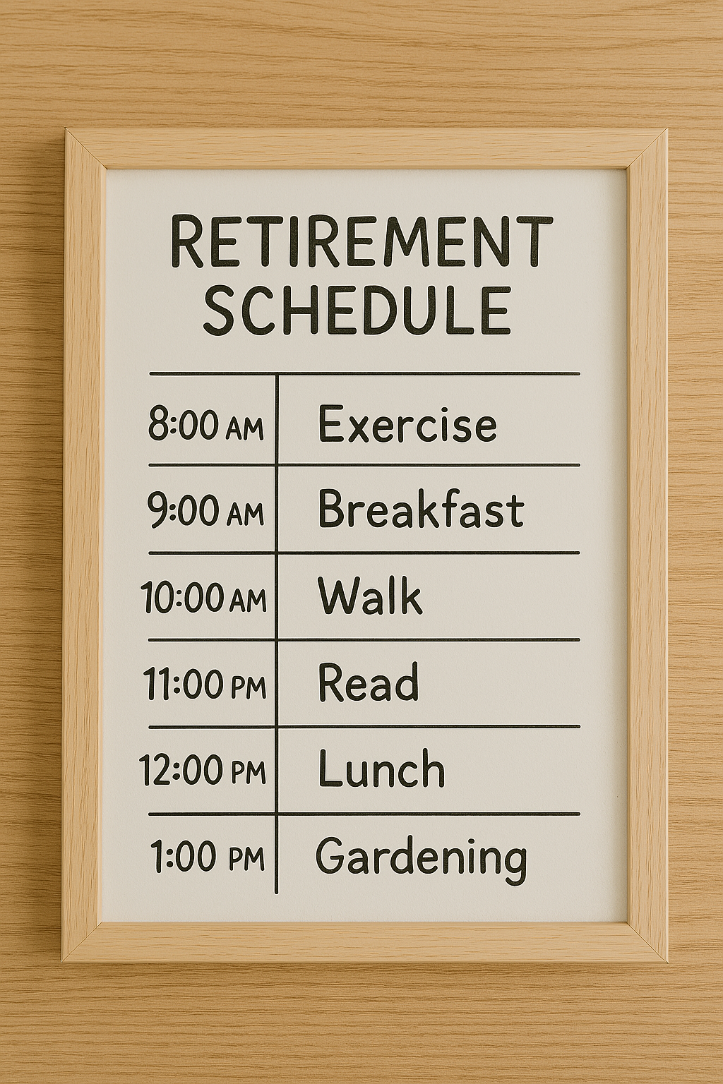 규칙적이고 의미 있는 하루 일과표는 은퇴 후 삶에 활력을 불어넣고, 건강과 행복을 유지하는 데 큰 도움이 됩니다. 정해진 틀에 얽매일 필요는 없지만, 자신만의 리듬을 찾는 가이드라인이 될 수 있습니다.