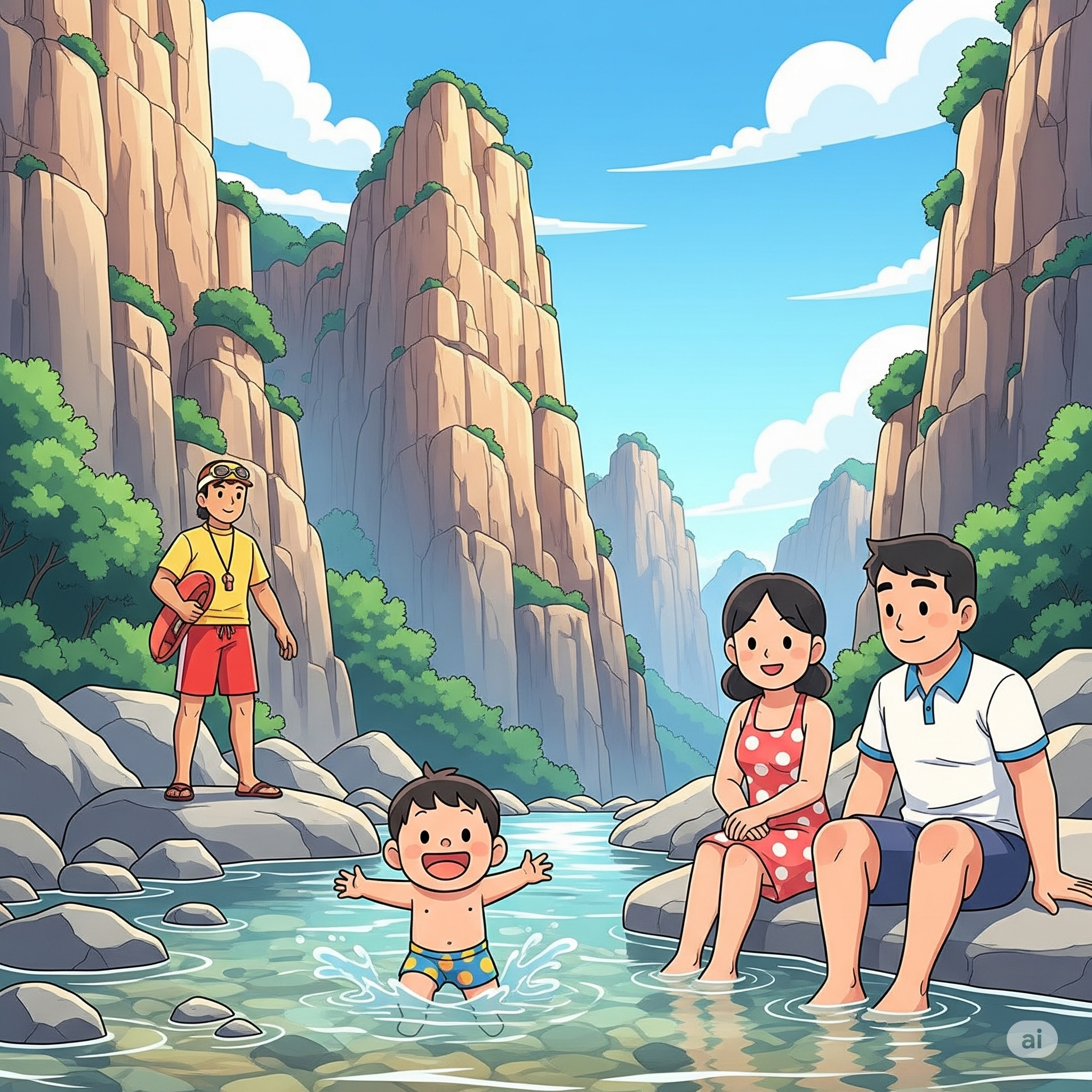 - 얕은 수심: 계곡 대부분이 어른 무릎 아래 깊이의 얕은 수심으로 이루어져 있어, 어린 아이들이 물놀이를 하다가 갑자기 깊은 곳에 빠질 위험이 거의 없습니다.