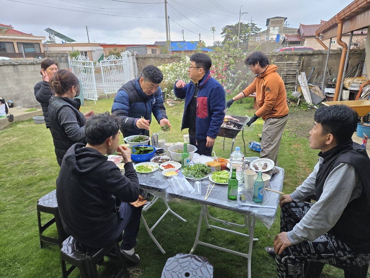 농사일을 마치고 먹는 저녁은 정말 꿀맛이었습니다. 준비해 온 바비큐를 장작불에 구워 가족들과 함께 나누어 먹었습니다.