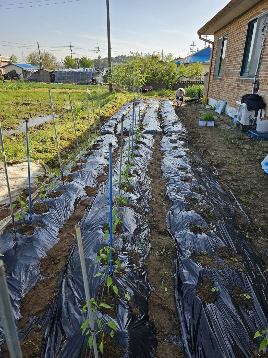 다음으로는 둑을 만들고 비닐을 씌운 뒤, 본격적인 모종 심기 작업을 시작했습니다.