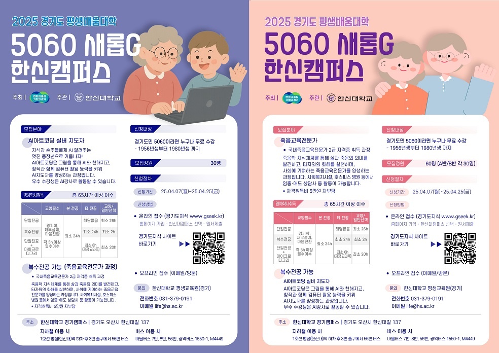바로 「2025년 경기도 평생 배움 대학 5060 새롭 G 한신캠퍼스 학습자 모집」이 공고되었고, 저는 망설임 없이 신청하게 되었습니다.