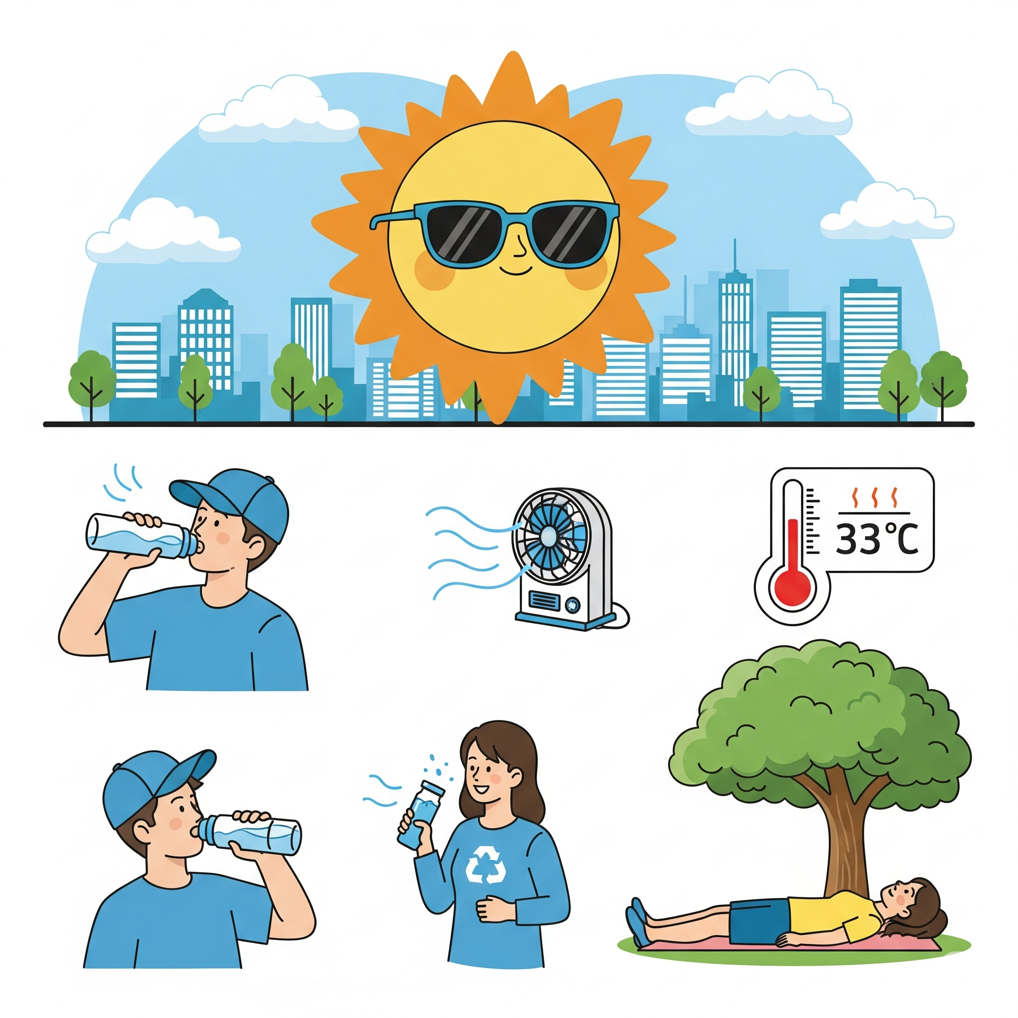 휴대용 선풍기, 쿨링 패치, 쿨 스카프 등 시중에 나와 있는 다양한 '쿨템'을 적극적으로 활용해 보세요. 옷은 땀 흡수가 잘 되고 통풍이 잘되는 헐렁한 면이나 린넨 소재의 밝은 색 옷이 좋습니다.